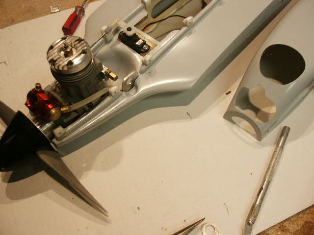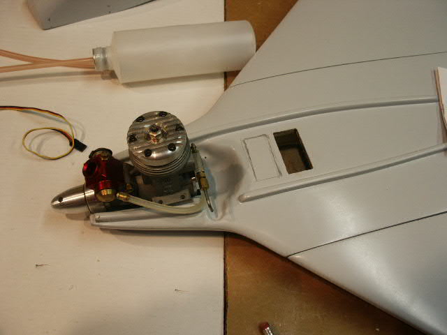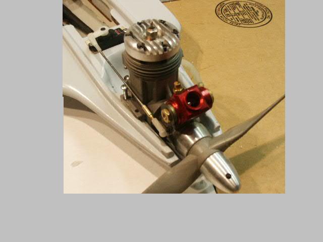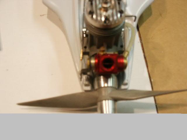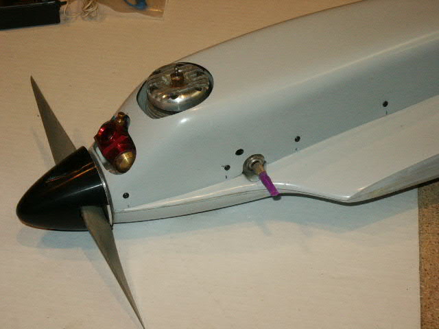 A Du-Bro fueler valve will be mounted behind and down a bit from the needle valve. See where the arrow is pointing about there. I have to make a bracket and cut the cowl. I did not care to snake fuel lines the the thin cowl because vibrations and the sharp edges would cut through the fuel lines.