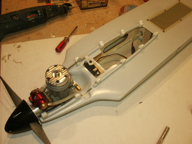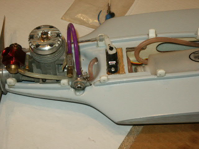 Next I cut the tank opening for the 8 oz Jett bubbless tank. Tank and line end up with interference with the throttle servo pocket. Oakdale OK'd my request to cut new servo pocket. Layout and cut the new pcket and find a former about 3/4" down . Hmmm a standard servo is going to stick up too haigh and hit the pipe! Reduce the pocket size and use a Hitec HS-81 miniservo. Grind a bit on the cowl rails to get the Dub Jett .60LX FIRE to sit nice and mock-up for the engine & pipe over the tank and servo. I will use a straight headder...A trip to the LHS .