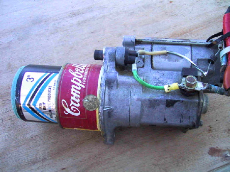 When things get serious, I drag out a serious starter. I converted this one from a Nippon Denso starter that was used on a Mitsubisi (sp) V6. The conversion consisted of removing the gear which engages the flywheel, taking the front end (the end next to the engine) apart and removing the spring which retracts the the gear then reassembling the front end. Next I drilled a half inch hole in the Miller R/C Products 3" drive cone to match the output shaft. Then a set screw hole (10-32) was drilled in the side of the cone. Next, several washers were put over the output shaft, the shaft pulled forward, and the cone installed. They shoulder against the output bearing on the starter and the back of the cone. If you don't pull the shaft forward then it will not be engaged. The Campbells soup can was used as a guard to keep the socket head set screw from knocking the c**p out of my hand.
