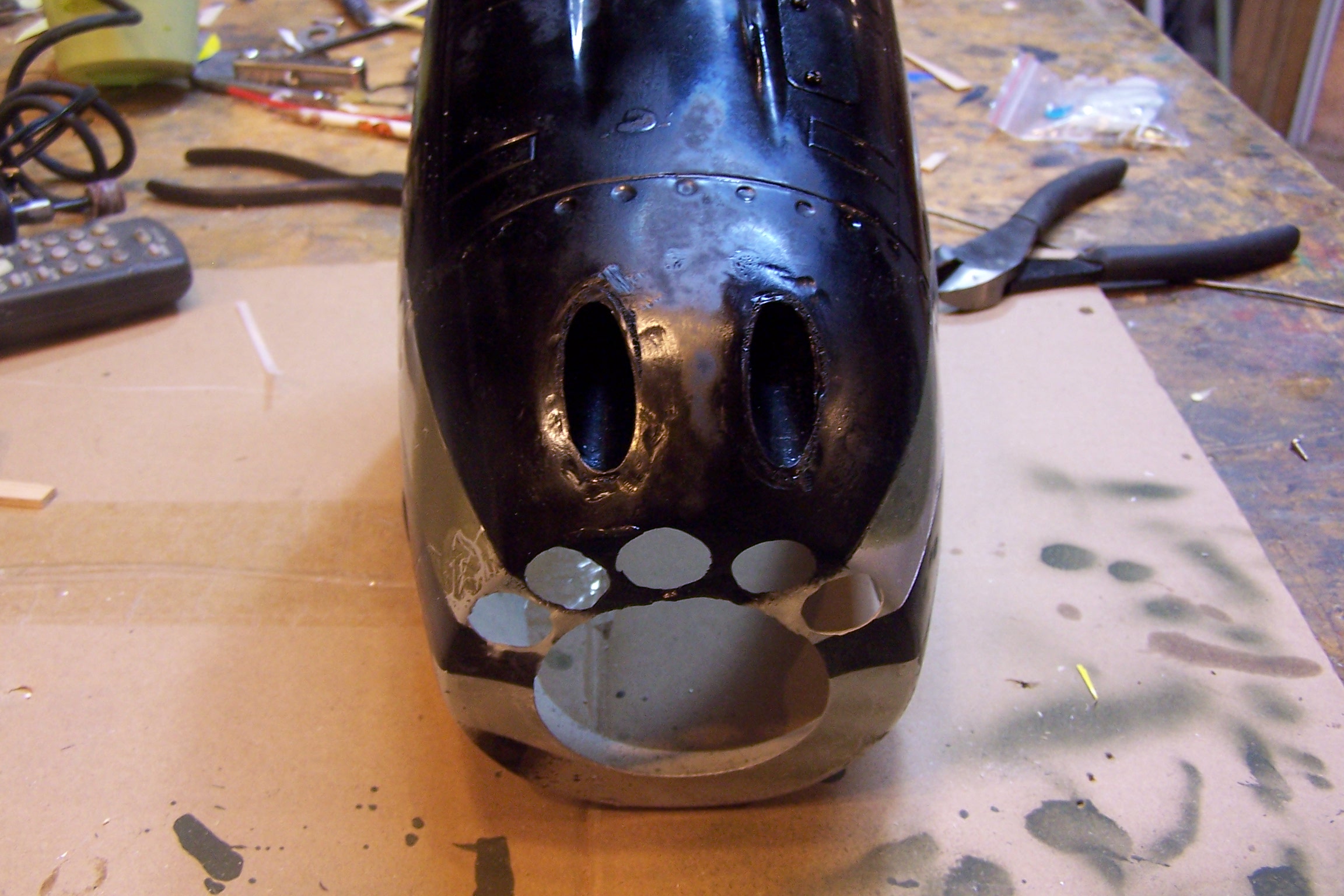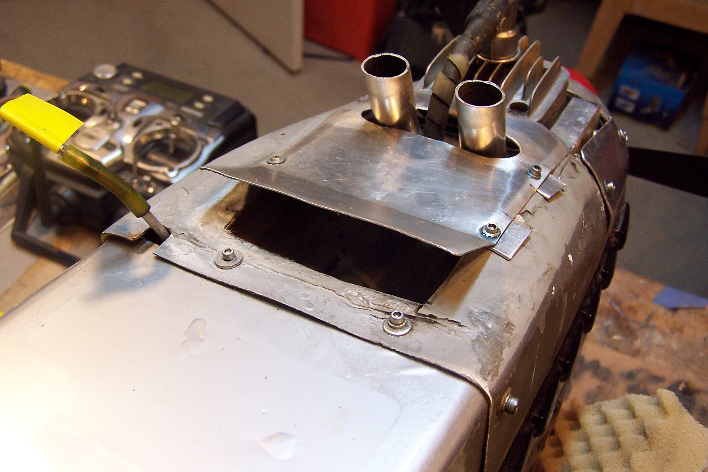 On the P-40 I also ducted air back to the carb. This was easier because of the top scoop. Notice I opened up the cowl flaps. Not sure if all this was necessary on the P-40, but certainly didn't hurt.