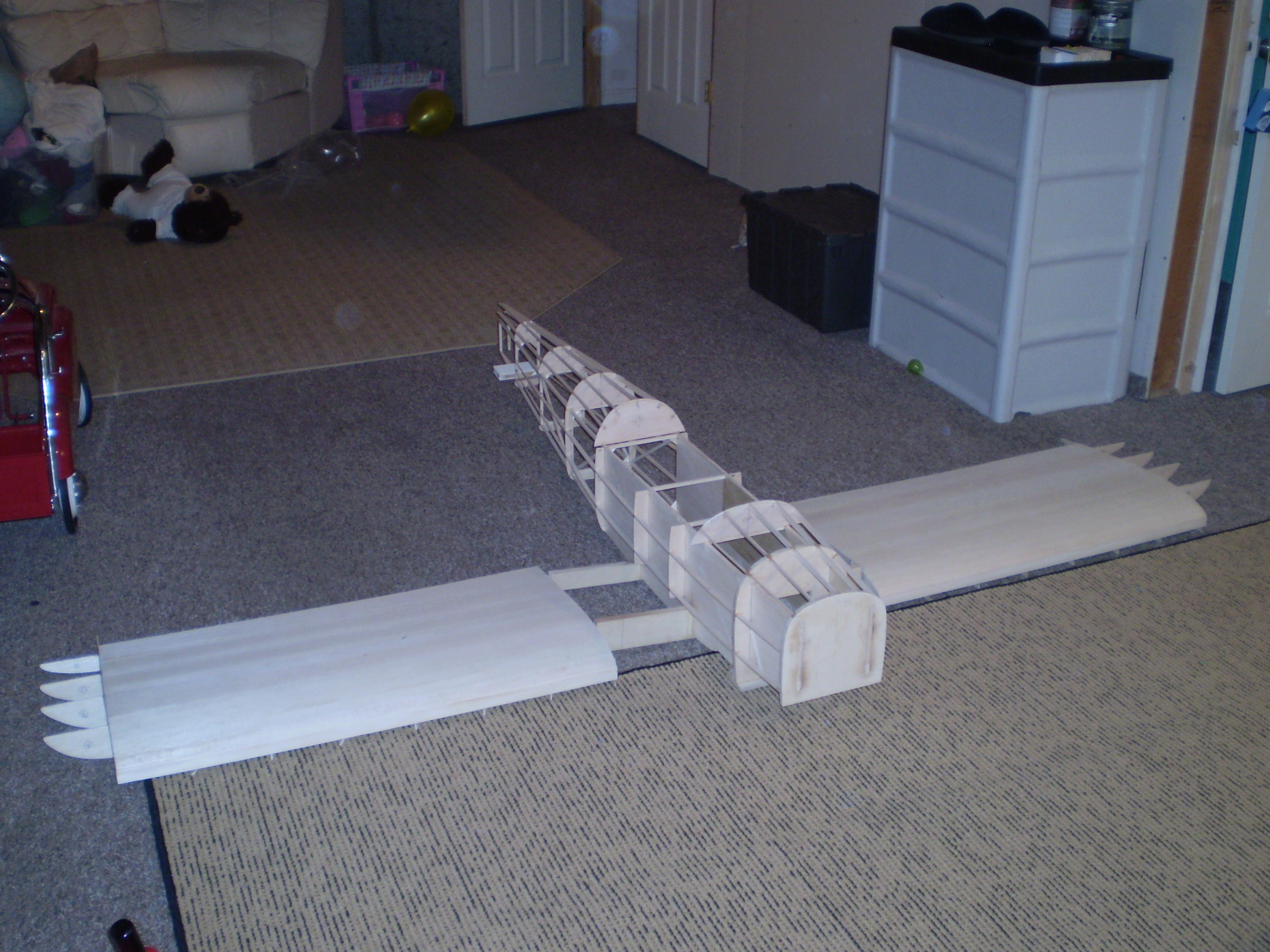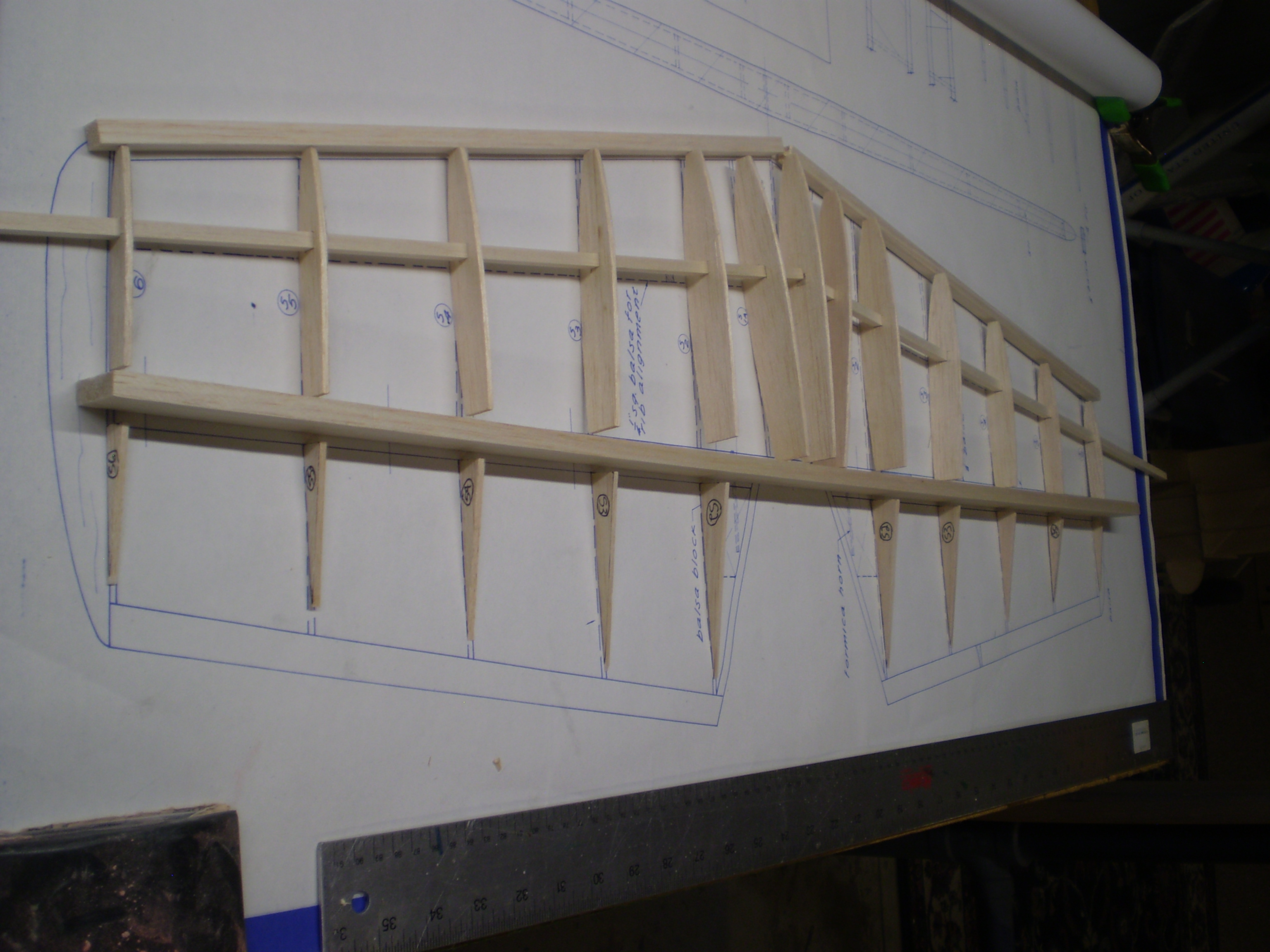 I have been working on the main wings and now have both sides completed. I also have the horizontal stab and elevators done and sheeted. I am currently working on the vertical stabilizer and rudder and hope to have that completed tomorrow. I am hoping to receive my fiberglass parts and landing gear soon.