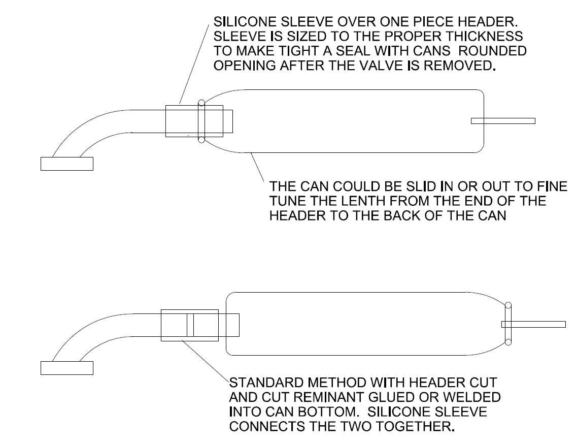 Anyway, when I was building my combat ships, the folks there were using a mouse can pipe set up like detailed in my drawing, using the top method with the one piece header pipe. In all my searching about MCP I have not seen anyone build one like this. They are all the conventional way. Is there a reason for this? The only thing I could think of would be that the header pipe is not supposed to support the muffler weight, however, the can can still be mounted to the aircraft and the silicone sleeve will still isolate the vibrations from the header to the can.
