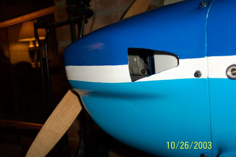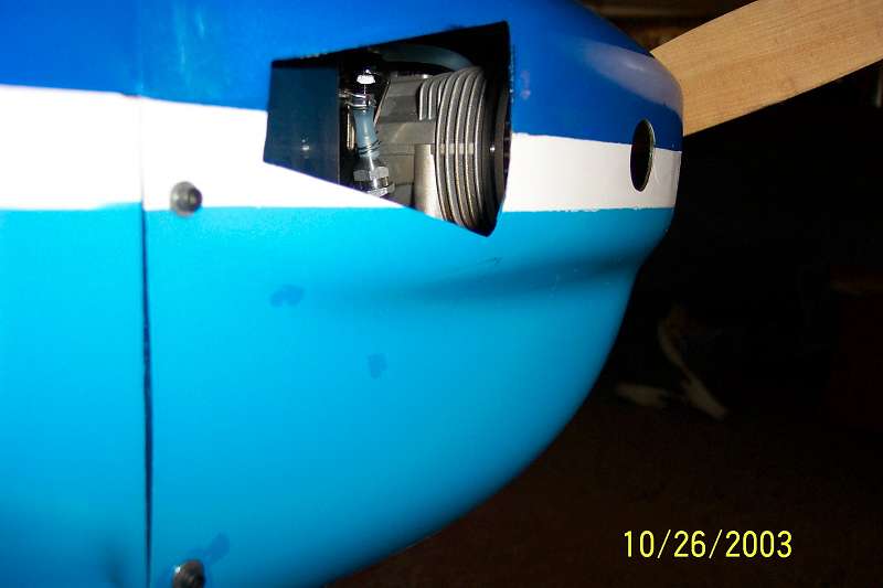 I'm still trying to solve the pre ignition problem and will try all and any modifications I'll have to make to achive that. First this morning I cut another vent on the cowl on the left side and enlarged the one on the bottom. I also found a restriction on the fuel filter ID diameter was just 3/32" which I enlarged to 1/8", which I think, will cause it to run lean,(the smoketrail has me puzzled) If too small a delivery fuel system : i.e. Fuel lines, filters etc. are too small for the engines demand, it may run, but run lean. But I'm no expert on that and need to investigate this even more.