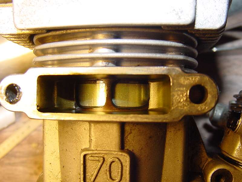 It had a near meltdown when the case line for the Perry pump broke causing a very lean condition. By the time I got it down, it melted the plug and was EXTREMELY hot. No burnt piston, scuffing or dis-coloring. It's had quite a few cases of fuel through it, is clean as a pin, all original, and runs like new. It has never had after-run or run dry and is stored right next to the planes. Notice that even the exhaust port and the inside of the crank are spotless. I've NEVER seen that with Caster! My other two heli engines look just like this.
