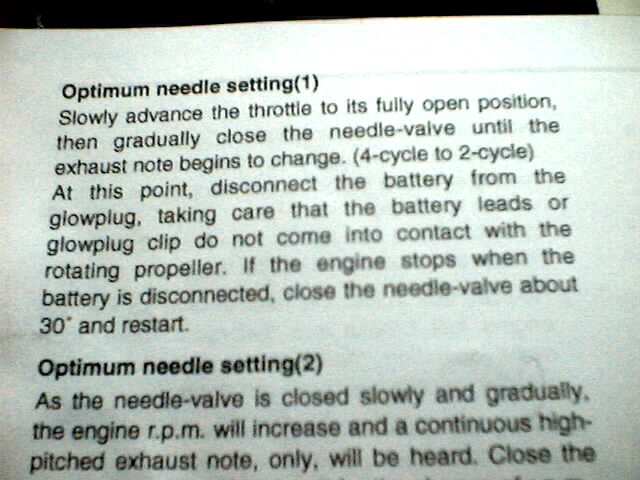 "1> BREAK-IN running should be done with the recommended propeller at a slightly rich setting. You want the engine to be at running operating temperatures. The needle valve should be set at a point just into this range from a four cycle setting."