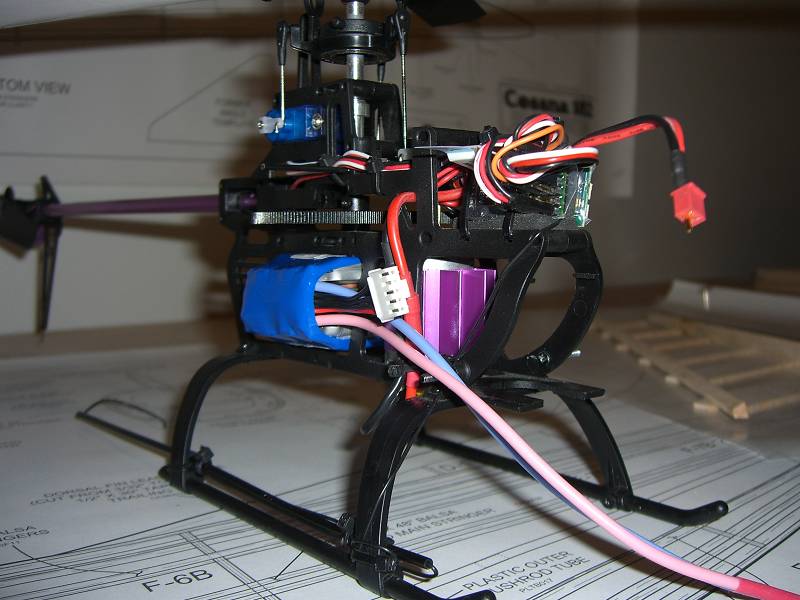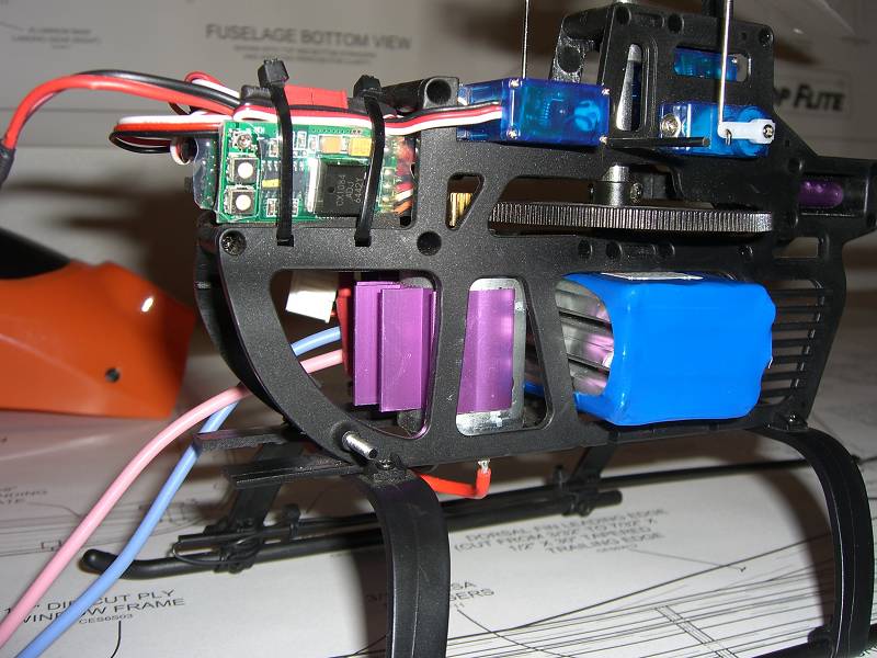 Tex, its mounted directly beneath the main shaft, only place it would fit. No battery at all where the stock pack goes, thats the reason for the 1.3 ounces in the tip of the canopy. I may try melting down some fishing weights to a simialar shape to the canopy nose and tape or glue them inside once I know if its going to work or not.