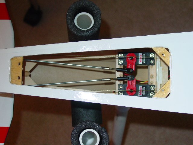 I'm also rebuilding an Ultimate from a crash (happened almost 10 years ago) and have moved the elevator servos to the tail. I have a YS120SF on it now but haven't balanced it yet. I put the servos (Hitec 525's) inside the rear of the fuselage with pushrods coming out the existing slots. Hope to fly it this weekend. Just have to finish the cowl. Here's a picture of the servos. I left the rudder servo in its stock location (Hitec 605)