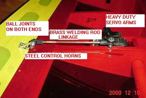 Note: Check the aileron linkages in the enclosed picture. I threaded brass welding rod to 440 size. Heavy, but cheap and very rigid. This was before I added flaps and went to smaller servos. I still use this type of linkage on all 4 wing control surfaces as it does not allow any flutter and high speeds.