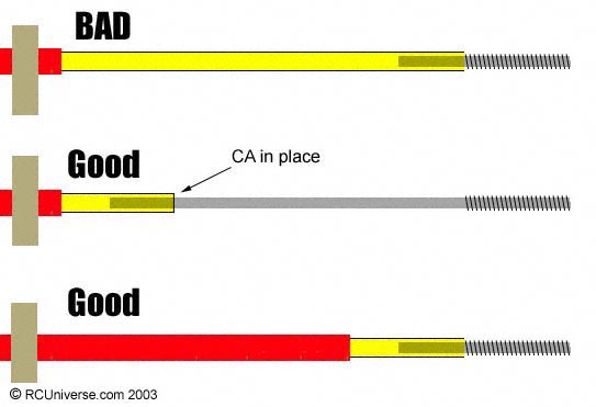 rickbrad, I do mine like MinnFlyer but use epoxy. Force a few drops in the tube with your push rod, spin it around to get it wet all the way. I try to get it in about 4 inches. I do this at both ends so I can use Z bends at the servos. If you don't want to see the ugly yellow tube, cut it so at max push it stops at the fuse edge. Also put a pinhole in the tube some where for a vent. I have some of these that are about 20 years old and you still cannot separate them.