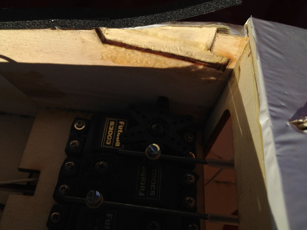 Cold weather and wind has hit and two weeks later I went to charge the plane and load it up for some Sunday flying. To my surprise I found both sets of wingbolt receptacles(?) and their reinforcing 1/4" triangle stock sitting on the ground. Obviously no flying today!