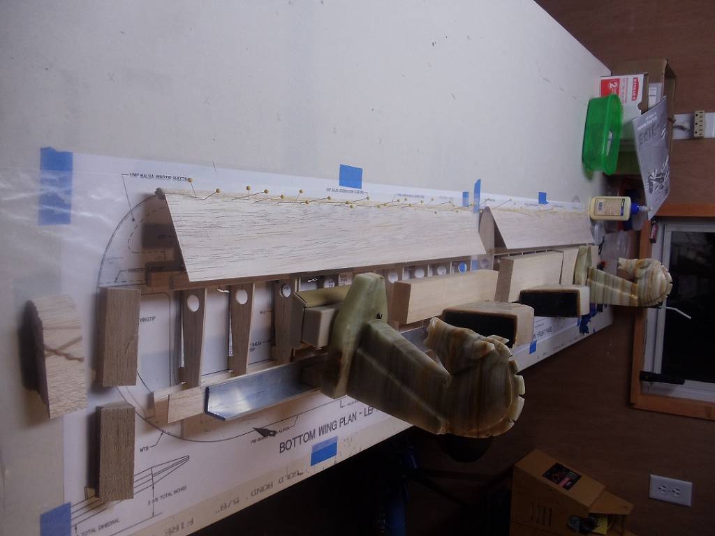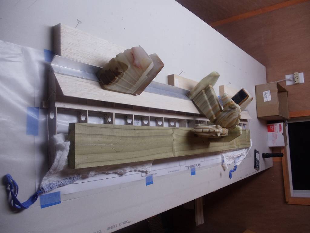 For JR.....how i went about the ticklish process of getting the root ribs in the lower wing halves positioned...A critical step.....I pinned the gage to the rib itself and then dropped ithe assembly into position prepared with t pins set on the plan line. When i got it where it need to be, i welded it to the lower spar. Be sure to double check that you don't shift things when you add the upper spar. Hope this helps.