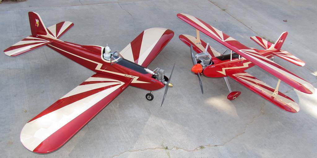No I dont have an incidence guage... should I check it? yes but I will fly her as is as everything looks fairly straight... I wouldnt even know how to tell if I need to add more positive or neagitve incidence in the top wing, the bottom wing to horizontal looks good. I usually dont get too carried away on exact measurelments but I suppose on a Bipe I should check... I am thinking you would need to fill in the top hole with CA or Epoxy and redrill the cabane struts or make a new pair. I traced every part on the Hog as I worry these days about kits being discontinued... I could build an entire Hog Bipe if I really wanted to from the plans and tracings. I do this on every kit I build these days. I think today might be the day to maiden her, it is looking pretty good for the weather. I remember seeing a video of one of these hovering on a Saito 100... impressive, in fact I really wanted a Saito 100 in my Bipe but I have the one I own in my U-Can -Do 60 and it is all trimmed and balancd as is so I dont want to change it. Actually the 95AX would be better suited for the U-Can-Do 60. Here are a couple of more pics I took outside with a little better light. I also posed it with my Astro Hog sister ship.