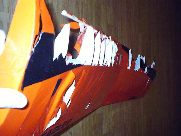-Today on takeoff my brother winged over, flew for awhile on a 90 degree knife edge toward the parking lot...and of course hit the hardest thing within miles...the parking lot. I watched it first hand about 20 feet away. Was actually afraid it was going to hit me. I even had a step forward to run to save it (not that I would at that speed...sigh) But it was heartbreaking to see. He rarely gets to fly and was excited to fly today, both of us were off from work.