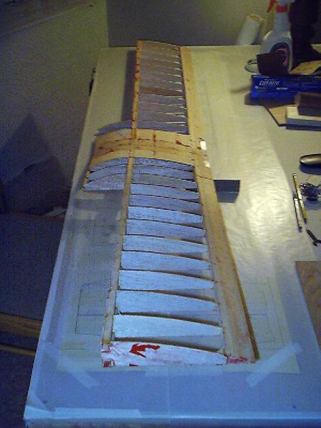 I got caught up in something last night on the web, next thing I know its 1 hour later. I of course found more things I want to buy. HA. Regardless, I still finished the construction portion of the rebuild which I knew wasn't going to take long. I did fubar it a bit because my ribs were a bit smaller in length than the first ones. But you cant notice. I also supported everything with balsa chunks throughout. I even dovetailed the dowel rods that fit together instead of gluing two ends together.