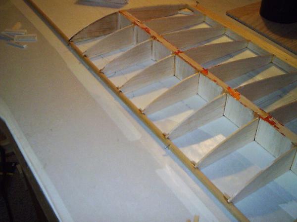I created a semi template from pieces I had, then tried to get everything about equal. Some are a bit short on the front dowel leading edge so to strengthen I cut little tiny pieces of balsa to support the sides. Also I put 3/16 x 1/4 strips of balsa along sides of the ribs where they join the spars. I should be covering by tonight, and flying tomorrow with some luck.