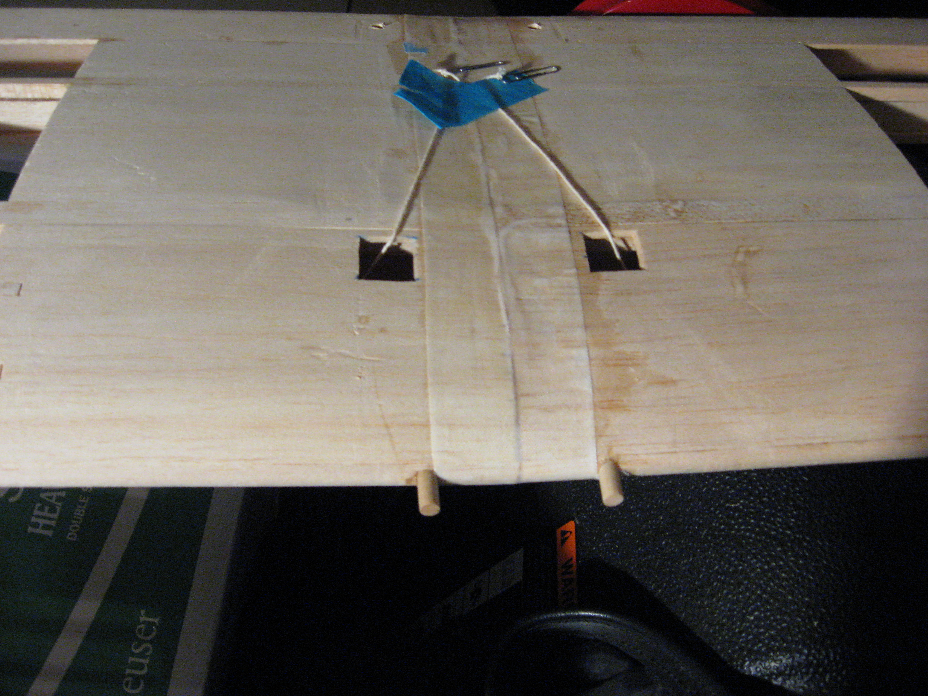 Cut a 3/8" hole in the covering at the appropriate location and slip over the dowel. You are going to have a seam at the wing center so you only have to worry about one dowel at a time. Speaking of the wing center, I couldn't help but noticing the void in the glass at the wing center. Unfortunately that void eliminates any strength that the glass is supposed to provide. I also like to extend the glass out past the fuse sides so that the wing sheeting will not get dented by the fuse sides. Under vibration the wing sheeting tends to get eaten up.