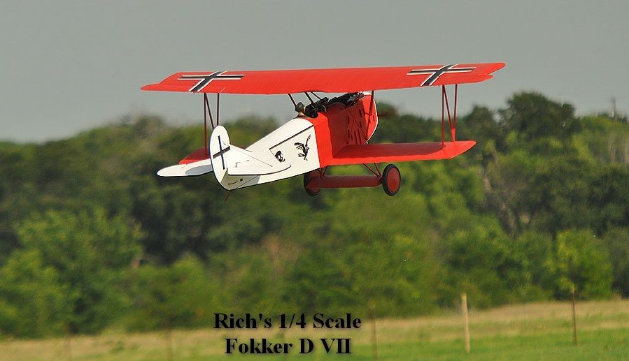 I build and fly WW I 1/4 scale war birds. I build Balsa USA kits, 2 Fokker D-VIIs, Spad XIII, and the Sopwith Pup. My current build is the 1/4 Scale Fokker DR 1 Tri-plane. All of these can be scale detailed to produce a beautiful flying airplane. Here they are in the BONES and finished.