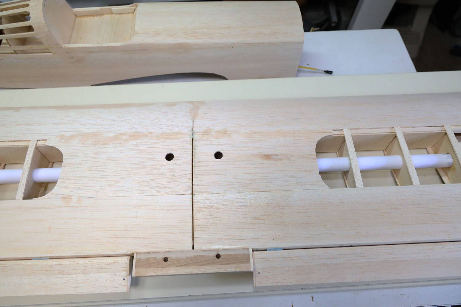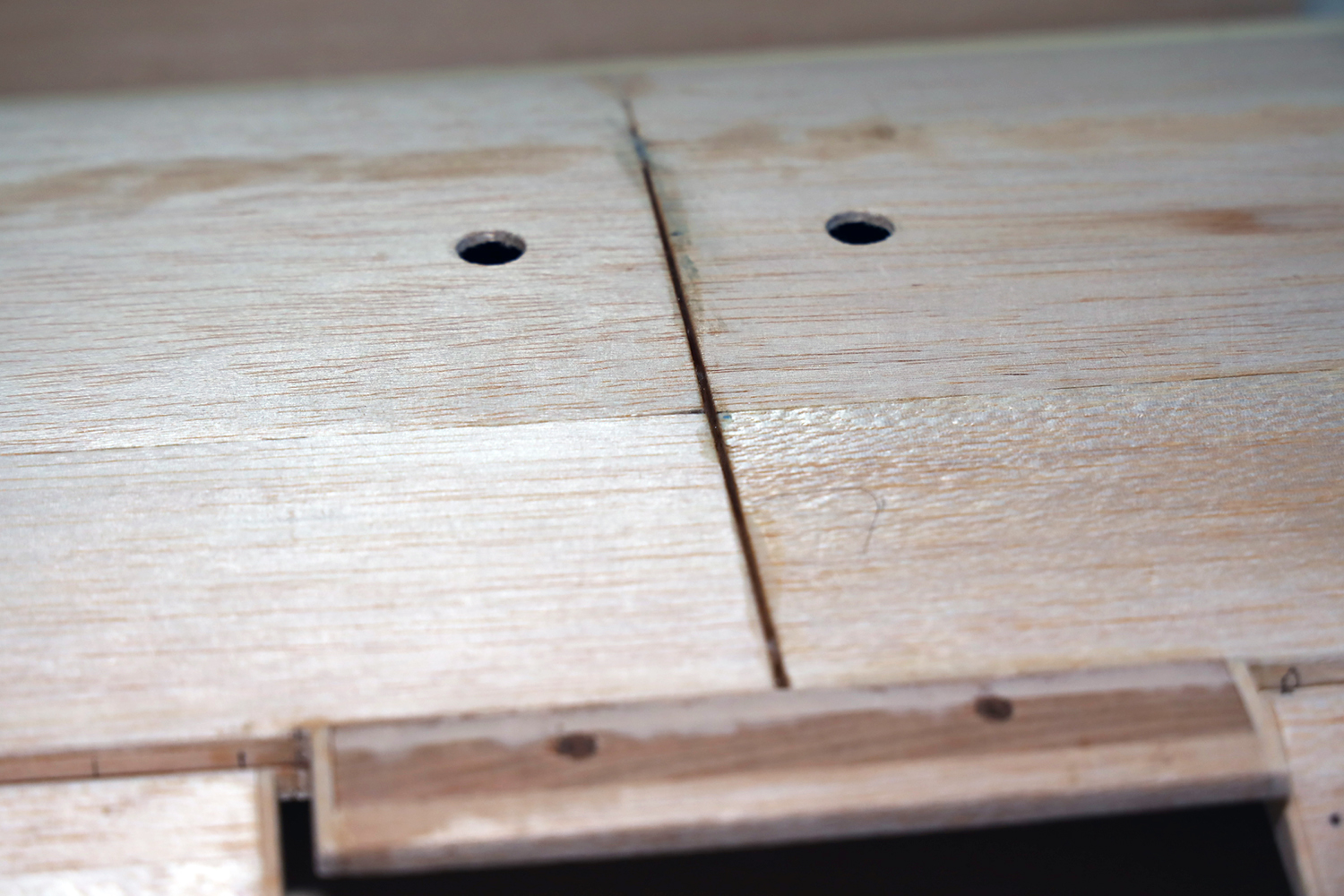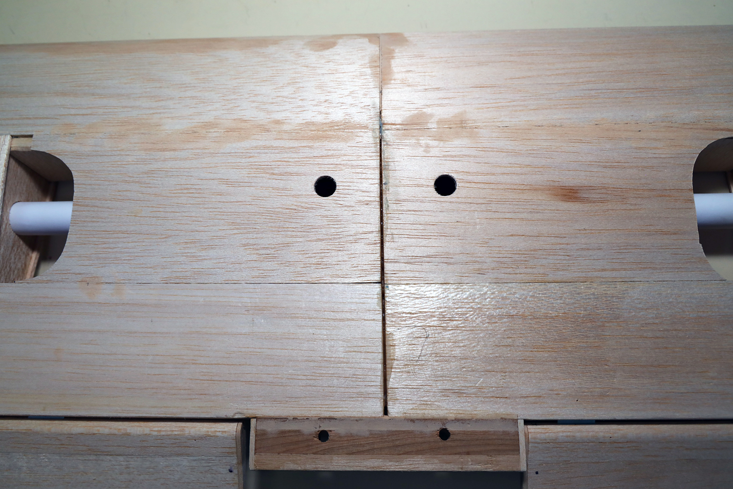 After joining (epoxying) together the wing halves, a near 1/16 inch gap occurred. I took a precaution to prohibit that, but something must have slid over night.