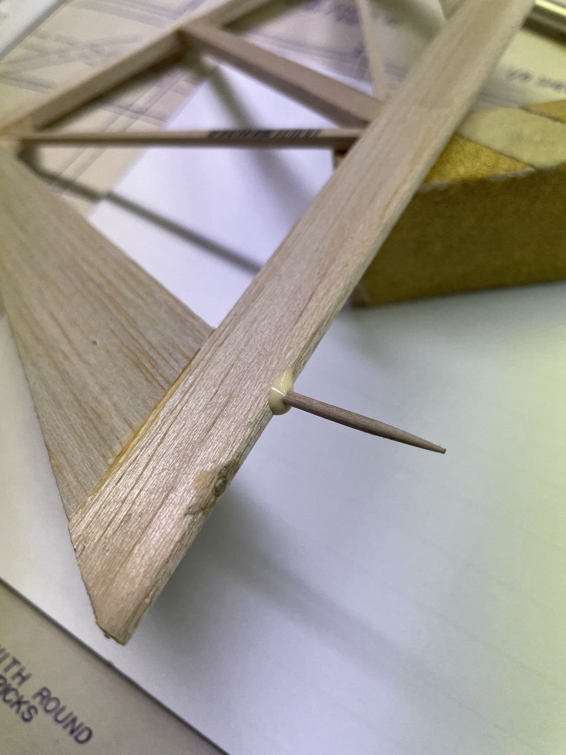 Anytime you want additional strength in a joint but can't put gussets or bracing, you can pin the joint after gluing it by drilling through the joint and using a piece of round toothpick glued in the drilled hole. It's surprising how much strength it adds without adding significant weight. The picture below shows pinning part of the rudder, but it works anywhere. You only need enough to go about 3/16" to 1/4" into either side of the joint: