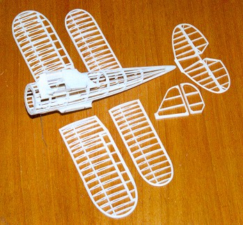 And here's a photo of a lighter way to make tail surfaces. It is thin strips of balsa soaked in warm water and wrapped around a cardboard or foamboard pattern and glued with a bit of