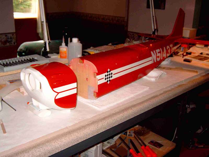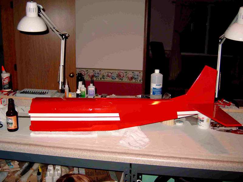 I have to paint the red sunburst on the wing, and finish the wheel pants. Then, I will be ready for clear coating the whole thing.