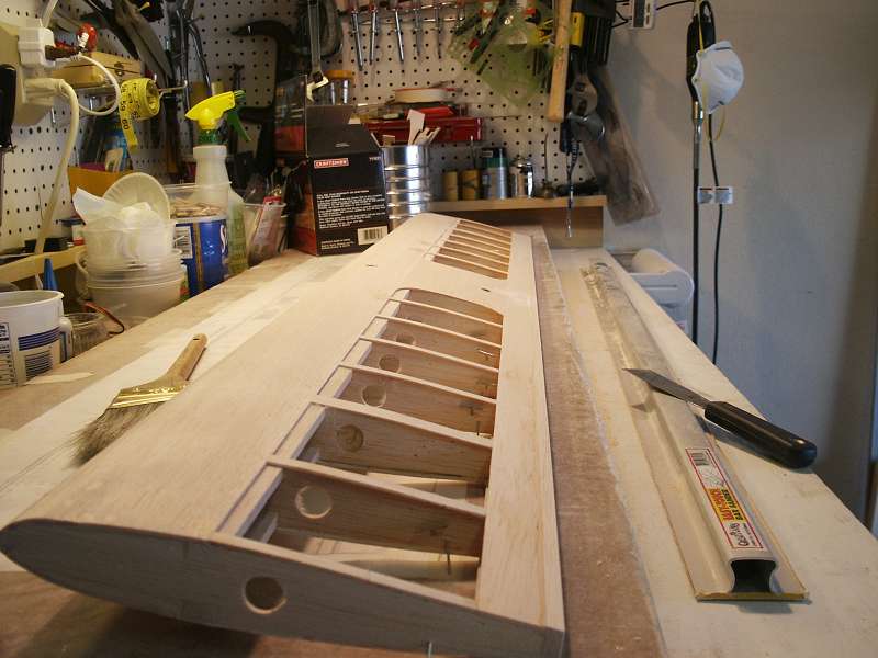I am now finished for today. Not only tired of sanding, but am waiting for some filler to dry where a hole in the sheeting on the trailing edge was. When it dries, I just need to do some finish sanding and then it is on to the wing tips. I figure that should be done by tomorrow. If I make it, I will have finished the top wing (including first time through sanding) in just 8 days. I doubt if I can keep up this pace, but only time will tell. Here are the latest photos: