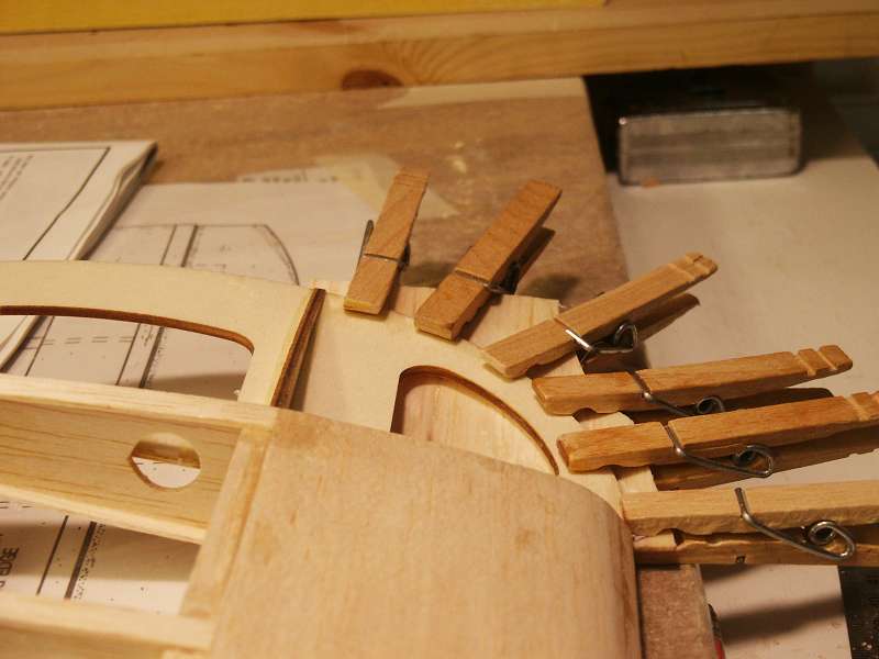 , but it really works well for bending the wood without splitting. After the wood softened enough, I pulled in place and clipped it with clothes pins. It did leave some small dents where they pressed into the wood, but I have had great success with using a covering iron and water to draw back out the surface. I will do this on during my finish sanding phase. Here are the pictures of my progress. I have both bottom wingtips in place and will continue with the top ones tomorrow. Would have done more, but I am still a little gunshy around the glues. A few days more and I will probably be gluing myself to the plane again.