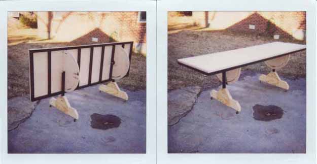 I wanted a good flat table to build on, so I welded up a 30"X96" frame out of 1 1/2" square 16 guage steel tubing, covered it with 3/4" plywood, and glued ceiling tiles to that so I could stick pins in it. It's mounted on steel legs with wheels so I can move it to work all the way around it and it will tilt 90 degrees either side of level. I also have two 30" by 12 foot benches in my workshop for catching all the junk that accumulates during a project.