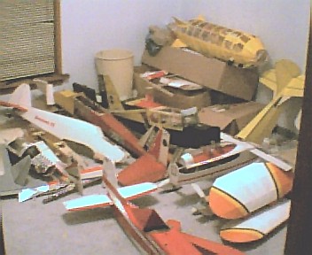 This is where all my waiting aircraft sit. I have anything for a F-22 to a plane that looks like a goose, to a Long EZ and as simple as a kadet senior. The blimp in the back ground will get wings, and will be a ducted fan later on in its like, neat huh?