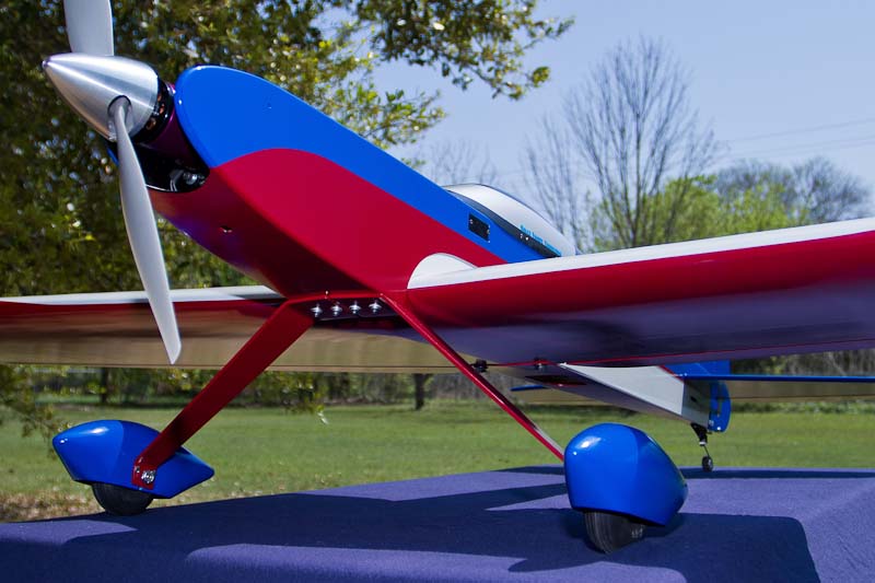 The main gear is the extended version that you sell, and the pants are from Fiberglass Specialties. I admit that I chickened out and removed the pants for the first flights. Good thing, as I ran it off the runway and into the plowed dirt once. I used a Sullivan unit for the tail gear.