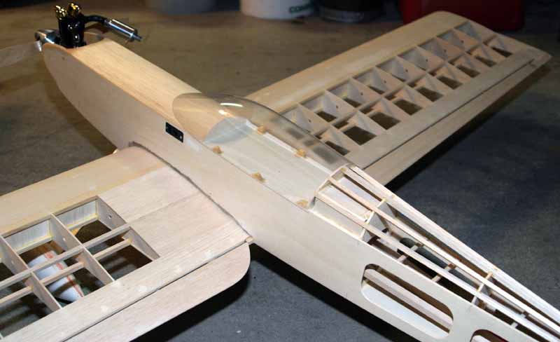 It's covered with Koverall and Brodak dope. I used a Hacker A50-14L with 8S lipos, controlled by CC Phoenix Ice 75. With a 16x8E APC prop, I only draw about 45 amps static, with over 10 pounds of thrust on the ground. Performance is spirited.
