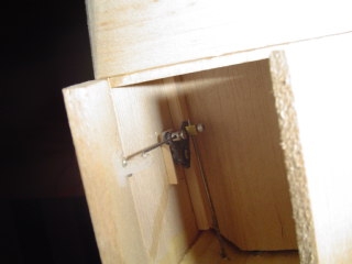The following are the pics of today's progress. I used a bellcrank system to actuate the bomb bay doors. Two bellcranks being driven by one servo through a "Y" shaped wire pushrod. The doors look pretty awsome as they swing open and closed. They open to about a 45 degree angle which will be plenty to drop the gumballs and the occasional GI Joe parachuter. It took some real tinkering to keep the servo from chattering. If the doors open further it puts the pushrods in a bind and the servo starts dragging. All in all it is a very realistic and rugged setup. The good part is that the doors close flush and firm. I am now in the process of building a glider tow hard point. I am going to use the same receiver channel for the doors and the tow release. I will just plug in whichever servo I plan to use that flight. My six channel Futaba is one channel short for my needs on this airplane! (Flaperons are using two of my channels)