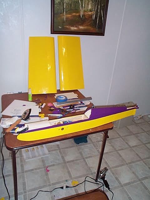 I brought it inside to cover because it seemed like I was getting more bubbles that normal. Might be the high humidity that we have been getting. Anyway here is a current picture, hopefully I will get to fly later this week. I will get the tail feathers and tops of the wings covered tomorrow. Should be on the control surfaces by afternoon.