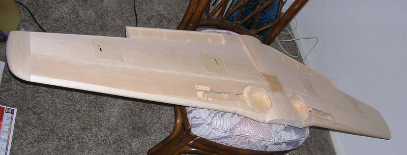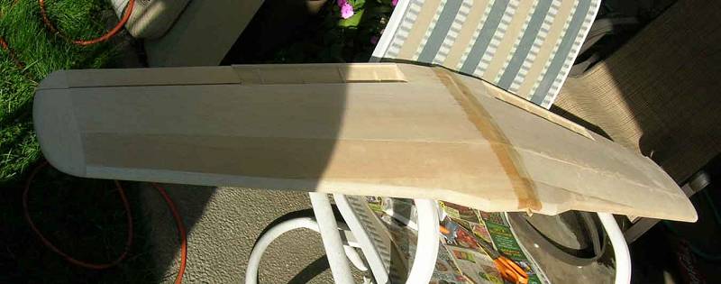 Thought I would try a different technique for finishing off my model. I used a wood sealer, then shot the wood with a sandable primer. Next, I gave the primer a quick sanding, then used a slightly watered down wood filler to fill in the grain and other defects. Finally I gave the wing another quick sand. I think this should give me a smooth painted finish without much weight.