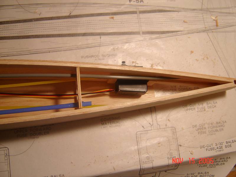 The small hole in front of the servo is where the strobe on the left will be, The small yellow tube under the servo is one of the rudder cable exits, the other gray tube is the antenna tube.
