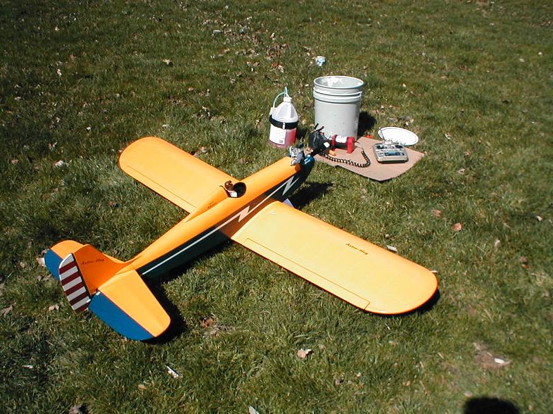 O.S. 70 Surpass 4-Stroke 13-6 prop, duel aileron servo's, took out half the dihedral plans called for, mounted landing gear under fusalage to prevent nose-overs. Futaba 3004 standard servo's. Camera takes bad color pics. It is covered in cub yellow and insignia blue monokote. Windshield, canopy and cockpit moulding are on but pic below is not up to date. Lots of carving and sanding on this hog after 3 months. Looks a lot better in person and lots of work building it.
