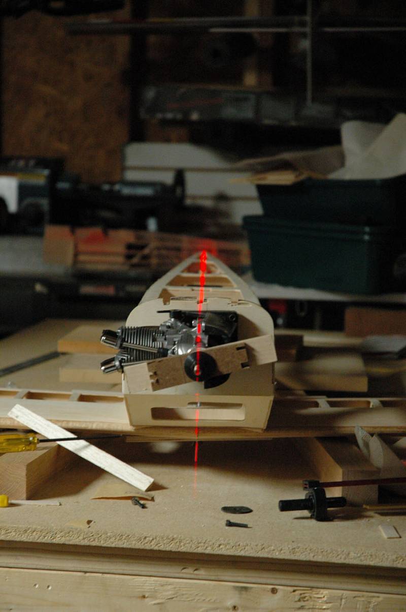 Ok, fate has decided which way it will go-I mounted the engine mount too far over. I had to add two washers under the engine, this is the Saito 1.25, but I noticed my laser was a little skewed so I might take one of the washers out. The inidence was set at 2 degrees right and down and the bottom wing came out to .1 degree of negative pitch (that's .1, I figured that's close enough because I would have to add material to the front of the wing or really dig into the back end of the saddle and that is a hard chore if you don't screw it up).