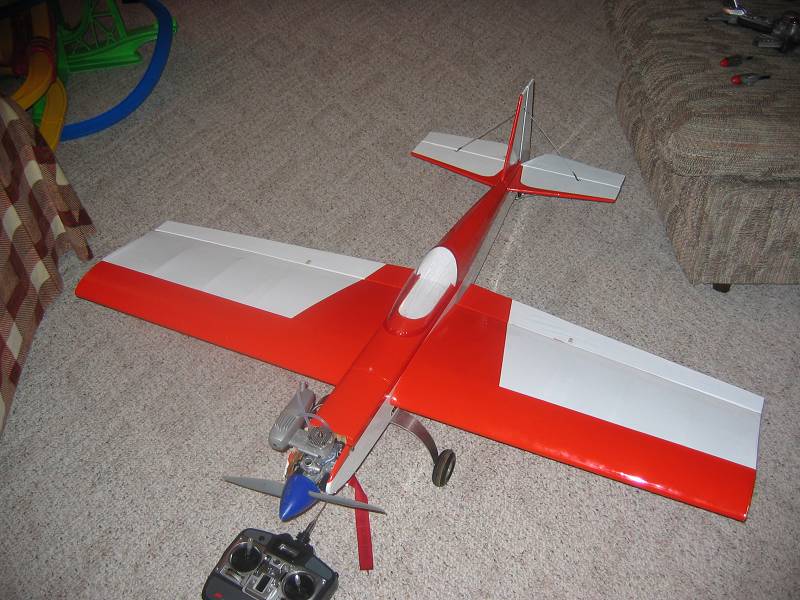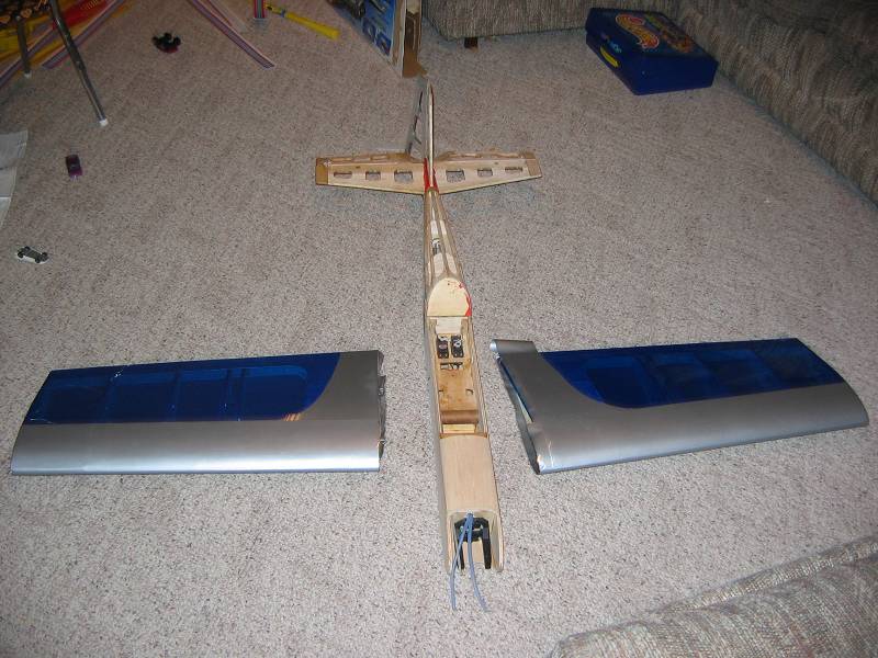 anyways i finally got done with most of the work, i still want to counterbalance the rudder, but the wings are rebuilt and covered, the fuse is all sanded down, just need more covering. I noticed one possibly fatal mistake. The covering scheme kinda sucks, i like the colors but it will be almost impossible to see very far away, im gonna give it a try and keep it pretty close, but if it gives me big problems i'll recover, i don't want to, but i will. heres the pics so far, lemme know what you think.I have made the ailerons just a touch bigger