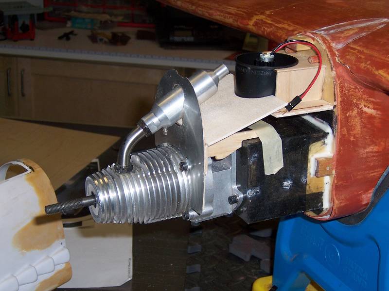 The hole in the side of the cowl is to allow clearance for the throttle linkage. Even with it's design, the fit of the engine is tight in width, and the carb is mounted on the side with the glow plug on top and exhaust at the bottom. The full scale spit has a smaller bulge at that point and I may cover it with an oversized version. It should add a little more flow but not much. There is also a small cutout in the plastic that the stacks are mounted to allow for clearance for the carb itself.