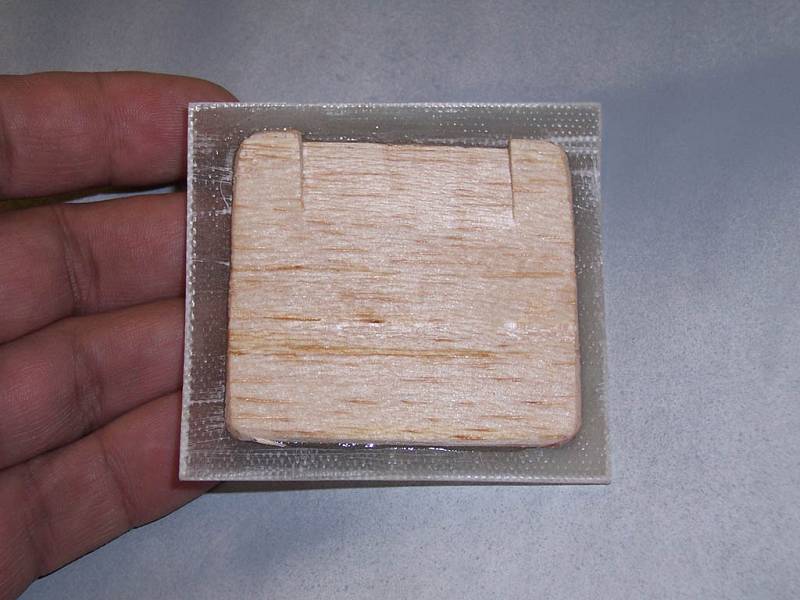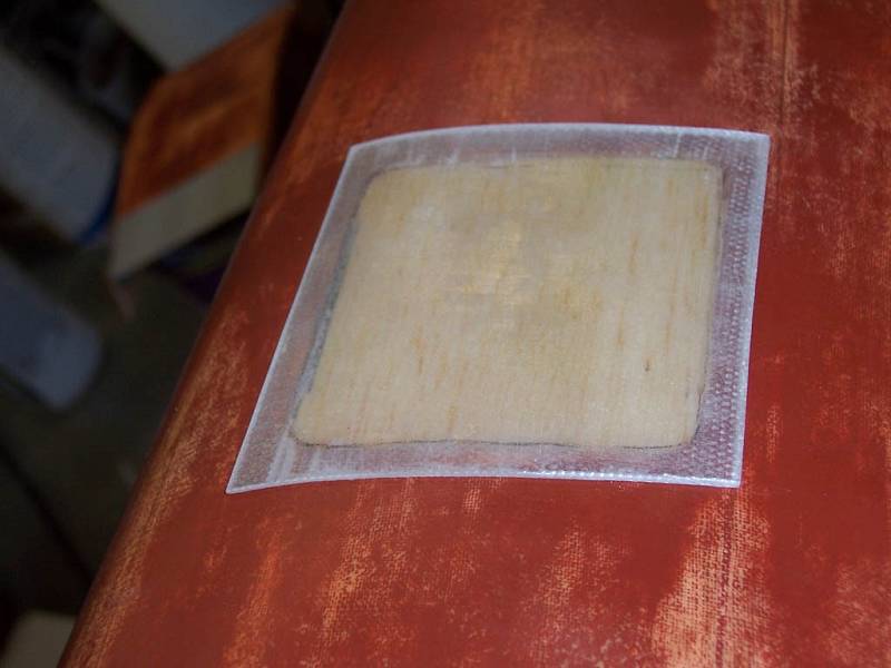 I then cut a piece of ultracote in a 5" square and taped it over the area with masking tape. I then hit it with a heat gun to pull any wrinkles out. I cut 4, 4" x 4" squares of 5 oz cloth, and 1 square of 1/2 oz cloth. I mixed up a batch of West Systems epoxy, using the slow hardener and added about 20% denatured alcohol. I used an acid brush and coated the area with epoxy. Then I laid the first cloth down and using more epoxy, fully whetted the cloth. I added a second layer of cloth brushing on more epoxy. I then used a piece of plastic to squeegee down the two layers, and remove excess epoxy. I added the next two layers in the same manor and again squeegeed the cloth. I finally added the last layer of 1/2 oz cloth, squeegeed the area, then brushed on a final coat of epoxy. (Third Photo)
