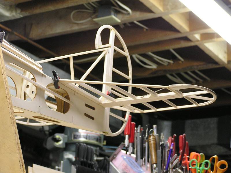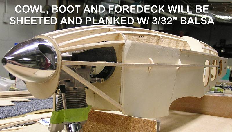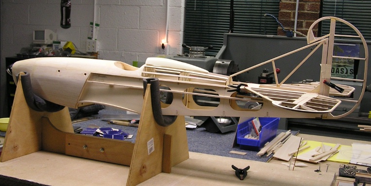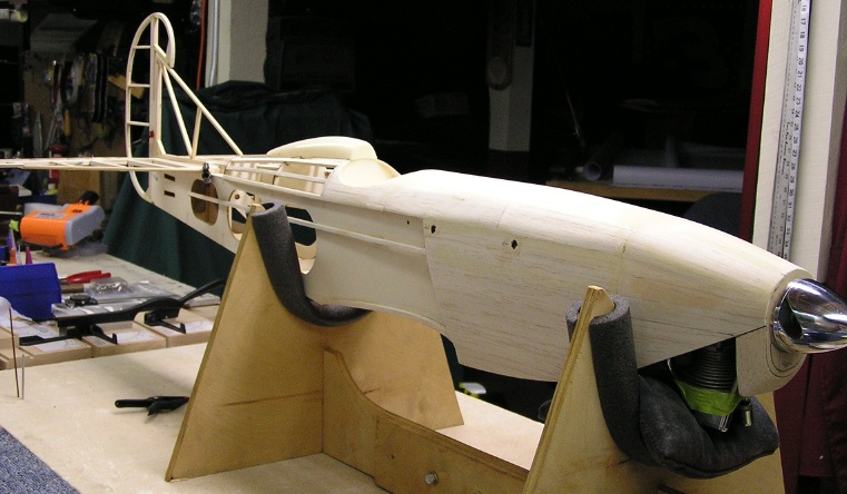 There are many other changes in the interest of styling such as a built up cowl and foredeck, formers and stringers to round out the fuselage, and the scratch-built tail group. Other mods to be done include der Jager specific landing gear and wheel pants, custom exhaust header, dummy cylinder heads on the sides of the cowl, functional flying wires on the tail, scalloped trailing edges of the wings, relocated cabane mounting points, 'N' struts instead of the Hog's 'I' interplane struts, and more........