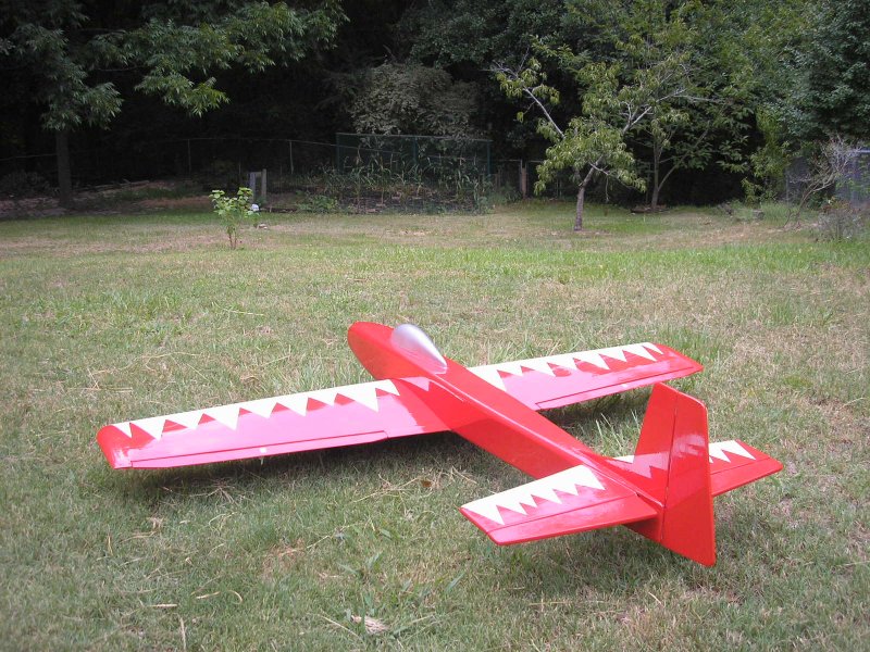 Here's some pics. It's a little red, ain't it?! Do you think I should do any more trim? Maybe something on the vert stab/rudder? You can't see it in these pics, but I painted the inside of the canopy with silver glitter paint. It gives it a translucent look and it sparkles in the sun. Ooooooo.... [8D]
