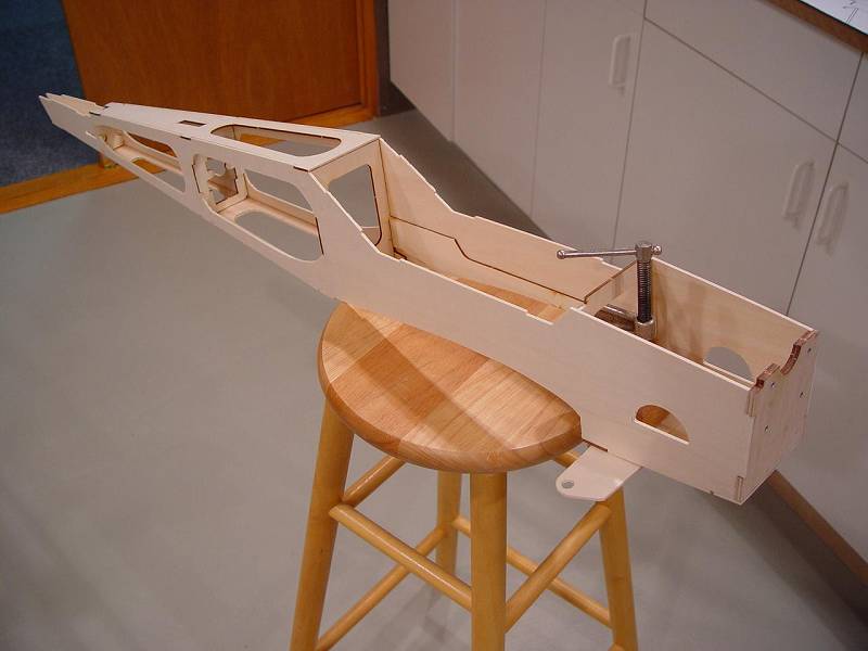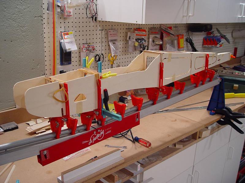 Pic 1: I got out the Adjust-O-Jig with the fuse attachment and set everything up to insure that the fuse is straight and square before gluing. I normally prefer to build with Tite-Bond wood glue, but the way that this fuse goes together almost mandates the use of CA. So I gave in and used CA to glue the fuse together.