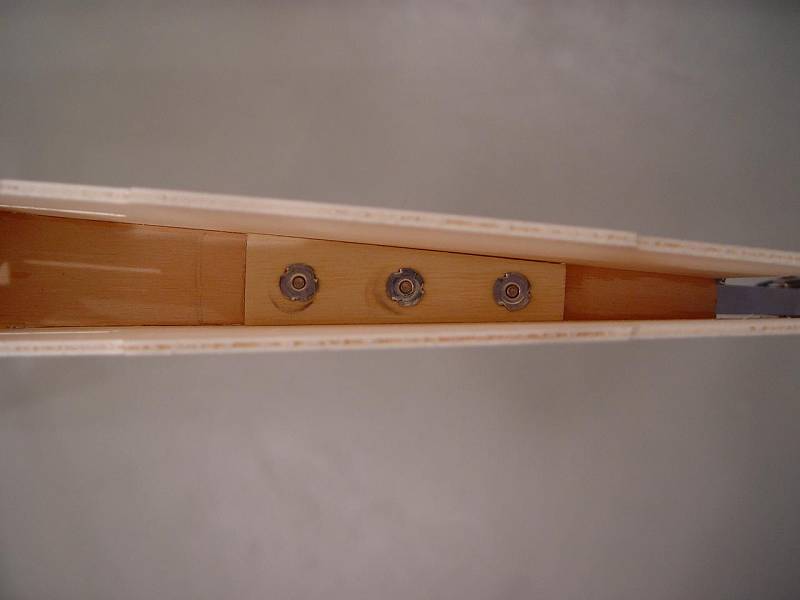 o.k. here is a couple of pics of my spar. its really hard to see though. my air lines are running through it. its 1/4" 5ply and its 11" on each wing panel. 22" long overall. in essence a tree trunk...