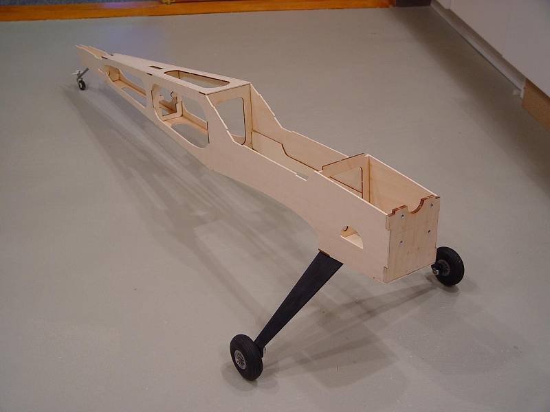 Pic 7: Framed fuse with landing gear and inverted engine mounted. The rear stab plate will get mounted when it is possible to set the stab incidence. At present, the plate sits lower than the fuse sides, so I want to insure that the stab mount is flat and at the appropriate incidence.