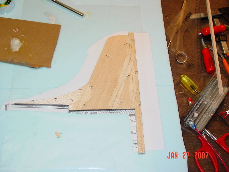 Ok, here are some more pics - the top wing is coming along pretty good, still needs to be sheeted, the trailing edge needs to be glued in and the wing tips... - I got it temporarily off the building board so I could build the stab and the fin......