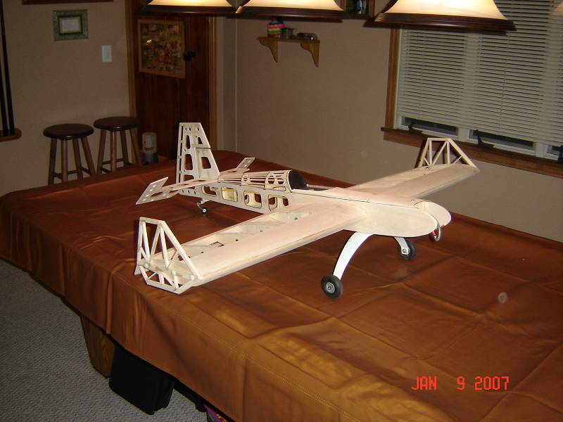 Here are the picts of my plane. Pretty much the same mods as OTE but some differences. I made my SFG's a little different. They are 11" tall. Notice the canopy and opening are quite a bit shorter than stock. I also stick built my rudder.