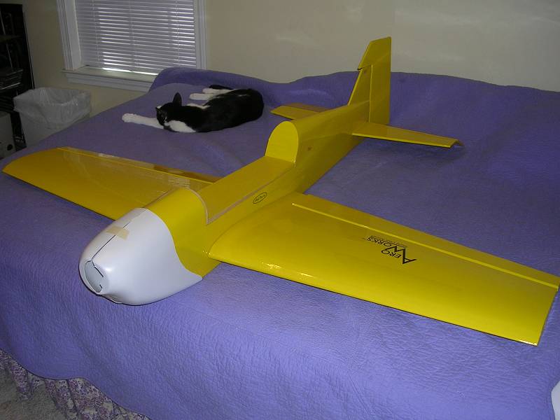 I am pretty sure it is not a Chipmunk. It resembles an Extra or a Giles, but the cowl is wrong for either of those planes. I have a Saito 150 I am going to put on it. Also, that bed happens to be that cats and he is very protective of it. Although he appears asleep, he is just doing some recon on the invader in his territory.