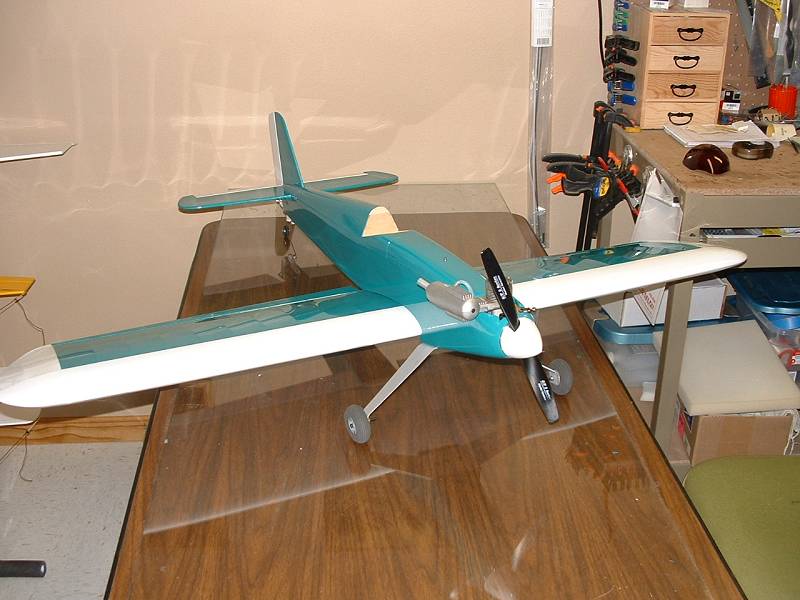 Well here it is a "Smoothie" I think the kit was a 1950 vintage control line model morphed in the 70's to R/C. I thought teal and white might be a 50's color that would be good for the plane. Still have to figure out the canopy and how to shape it to fit. Fun build-have NO idea how it will fly.