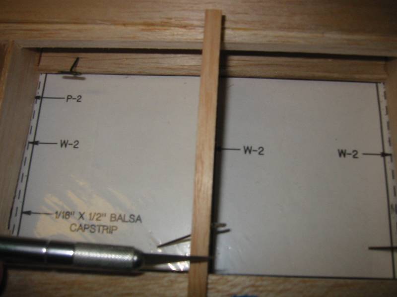 I cut the cap strips out next. Not much to show here, really. Its a fairly simple step. Picture3 shows how I use my Exacto Blade to measure the proper length of balsa - hold it in place on the wing and press on the strip with the blade to make a small mark. Put the wood on a cutting surface and finish the cut - perfect fit every time